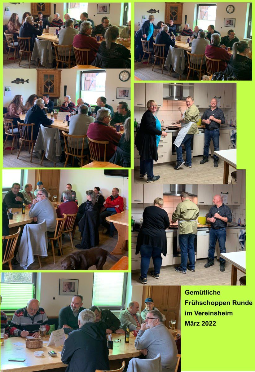 Zunächst wird in kleinen Grüppchen eifrig gefachsimpelt - über das Wetter, den Zustand des Eckhausee oder den jüngsten Klatsch und Tratsch. Dazu genehmigte man sich die erste Flache Bier, Weiß-oder auch Rotwein. Selbstverständlich sind auch alkoholfreie Getränke verfügbar. Der Hüttendienst ist gut eingespielt und versorgt die Gäste zügig mit frischen Getränken und deftigem Imbiss.